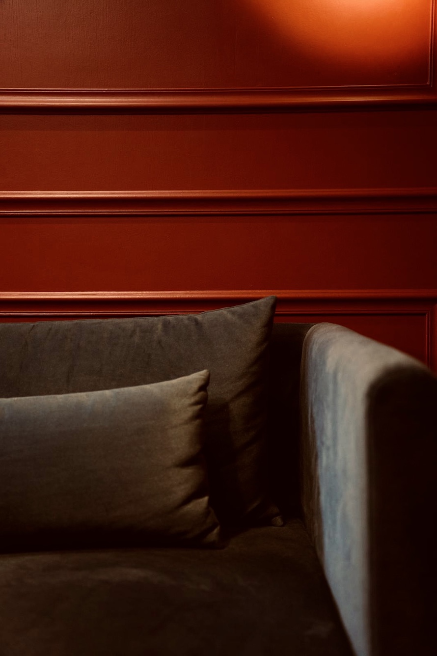 Les couleurs chaudes ainsi que les matières tel que le velours apportent une sérénité à la pièce: on s’y sent bien.