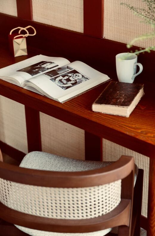Pour cette partie du projet, l’architecte a voulu insuffler un goût du voyage en s’inspirant du style colonial. Le rotin a été utilisé sur les murs pour créer une ambiance chaleureuse et exotique, évoquant les destinations lointaines et les aventures. Ce matériau naturel, à la fois élégant et intemporel, apporte une touche de raffinement et de confort.