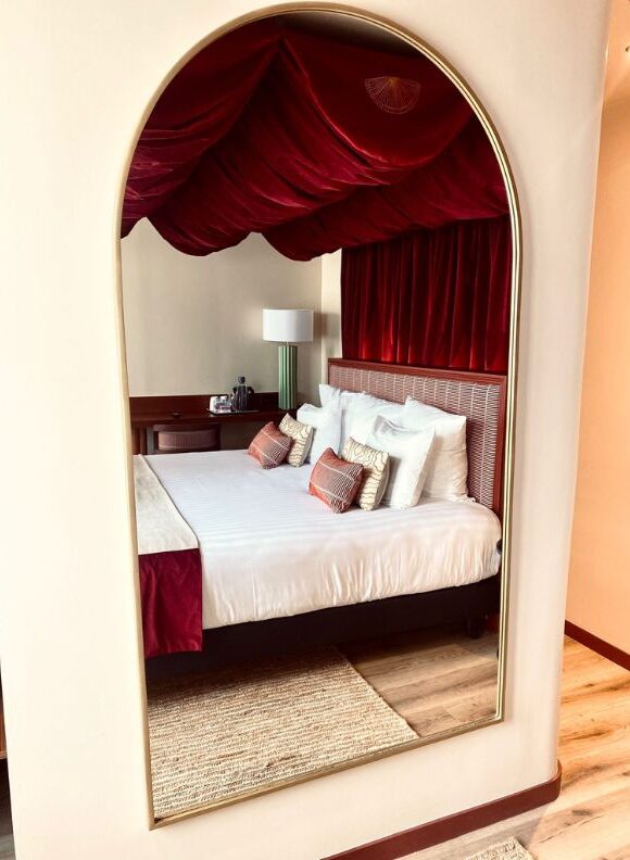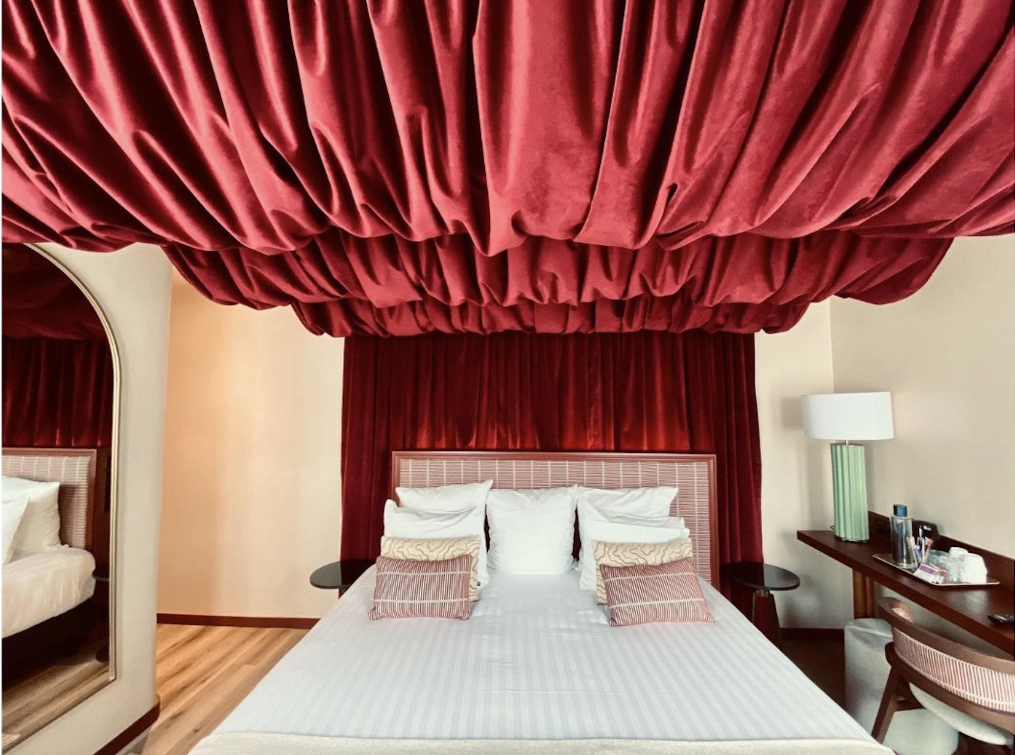 La chambre nuptiale du 5ème étage a été décorée de manière grandiose et théâtrale. Un ciel de lit en velours rouge a été ajouté, conférant à la pièce une atmosphère romantique et opulente. Ce choix de décoration s’harmonise parfaitement avec le thème théâtral de l’hôtel, tout en ajoutant une dimension de luxe et d’élégance.