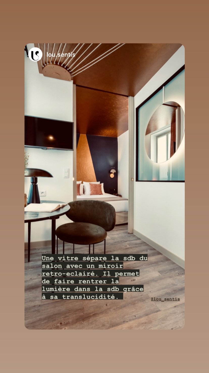 Un miroir rétroéclairé est placé entre la chambre et la salle de bain pour accentuer le volume de la pièce .