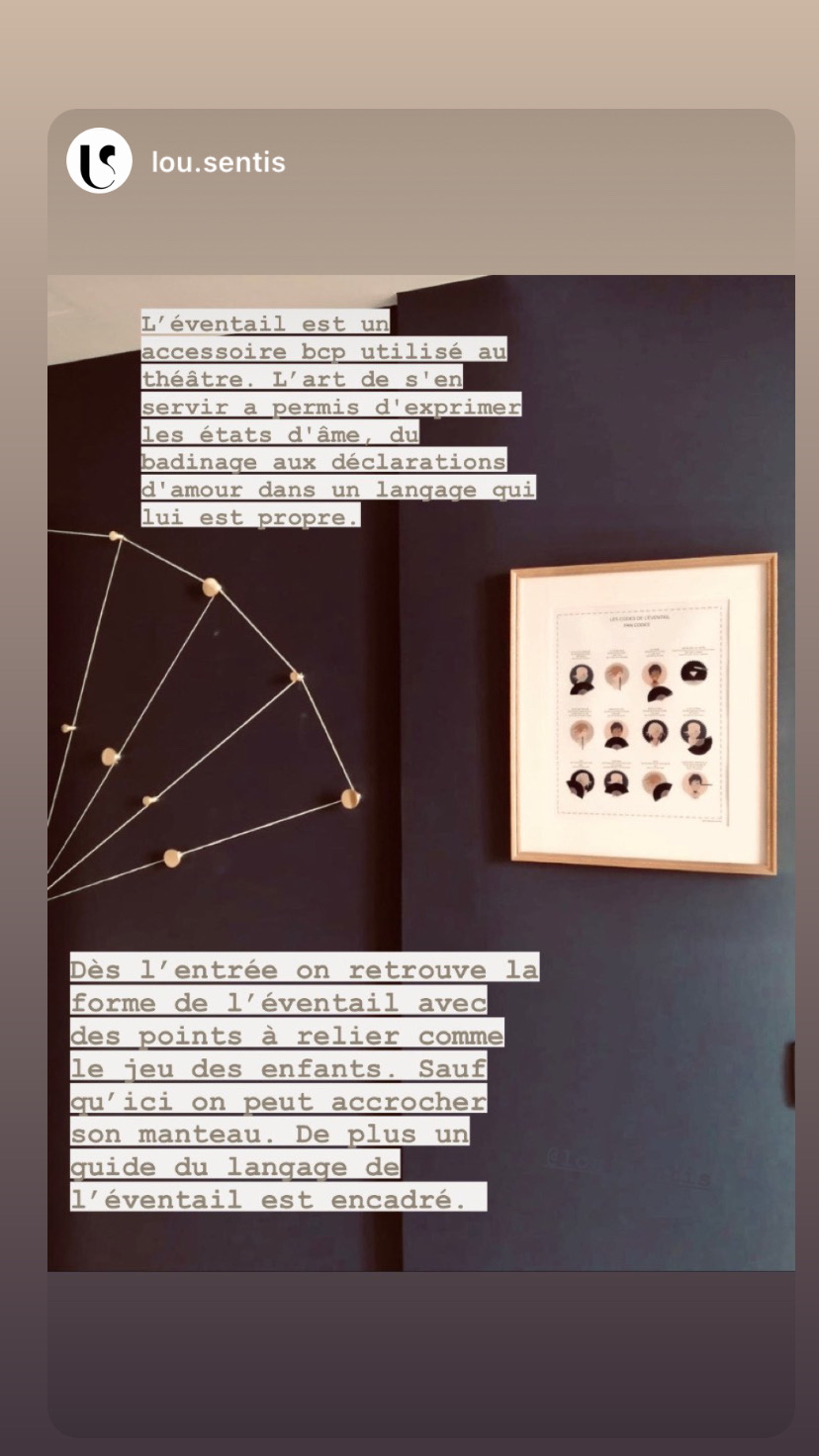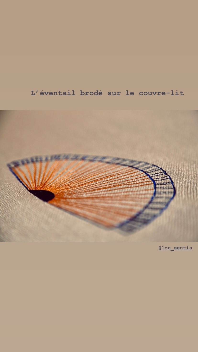 On le retrouve au mur encadré dans des petits tableaux, sur le lit par des jetés de lit spécialement fabriqués et brodés d’un éventail, et par des patères dorés servant de porte-manteaux ,disposés en forme d’éventail.