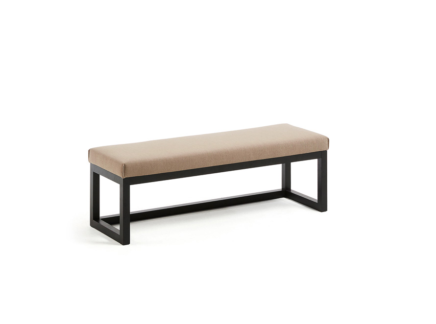 La banquette est tapissée de tissu marron clair ,la structure est en bois de hêtre massif.