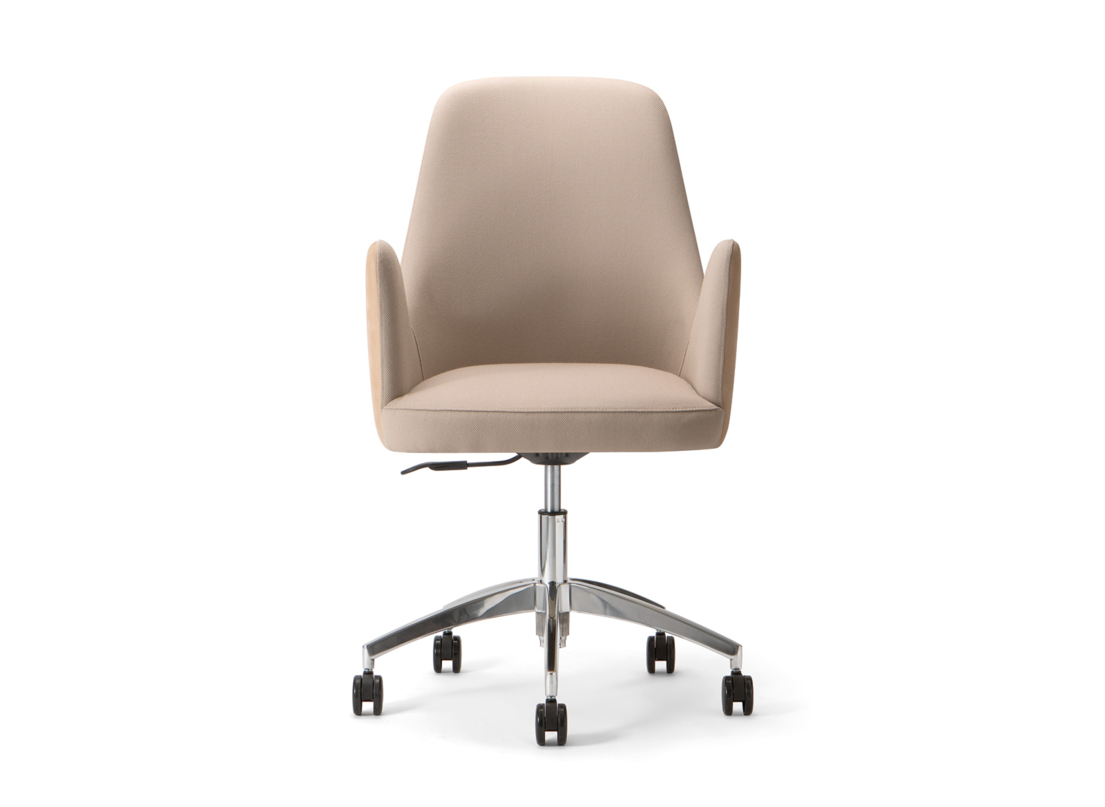 Fauteuil de bureau sur roulettes, existe avec des pieds bois ou métal, avec ou sans roulette:11 différentes bases. Tapissée tissu ou cuir ou avec tissu client.