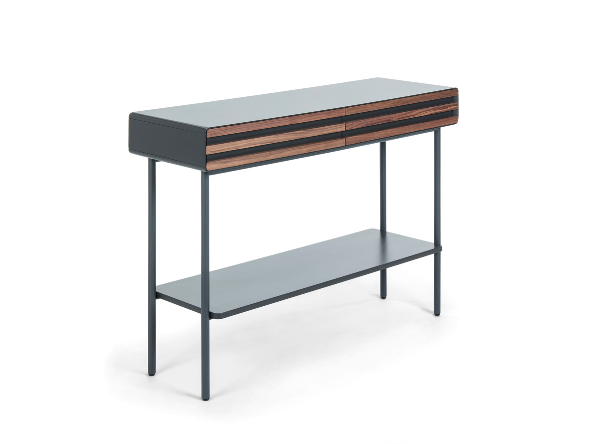 console avec structure en MDF laqué en graphite mat. L’avant avec tiroirs en placage noyer, pieds métal. Couleur graphite. produit d’importation raisonnable du point de vue prix.