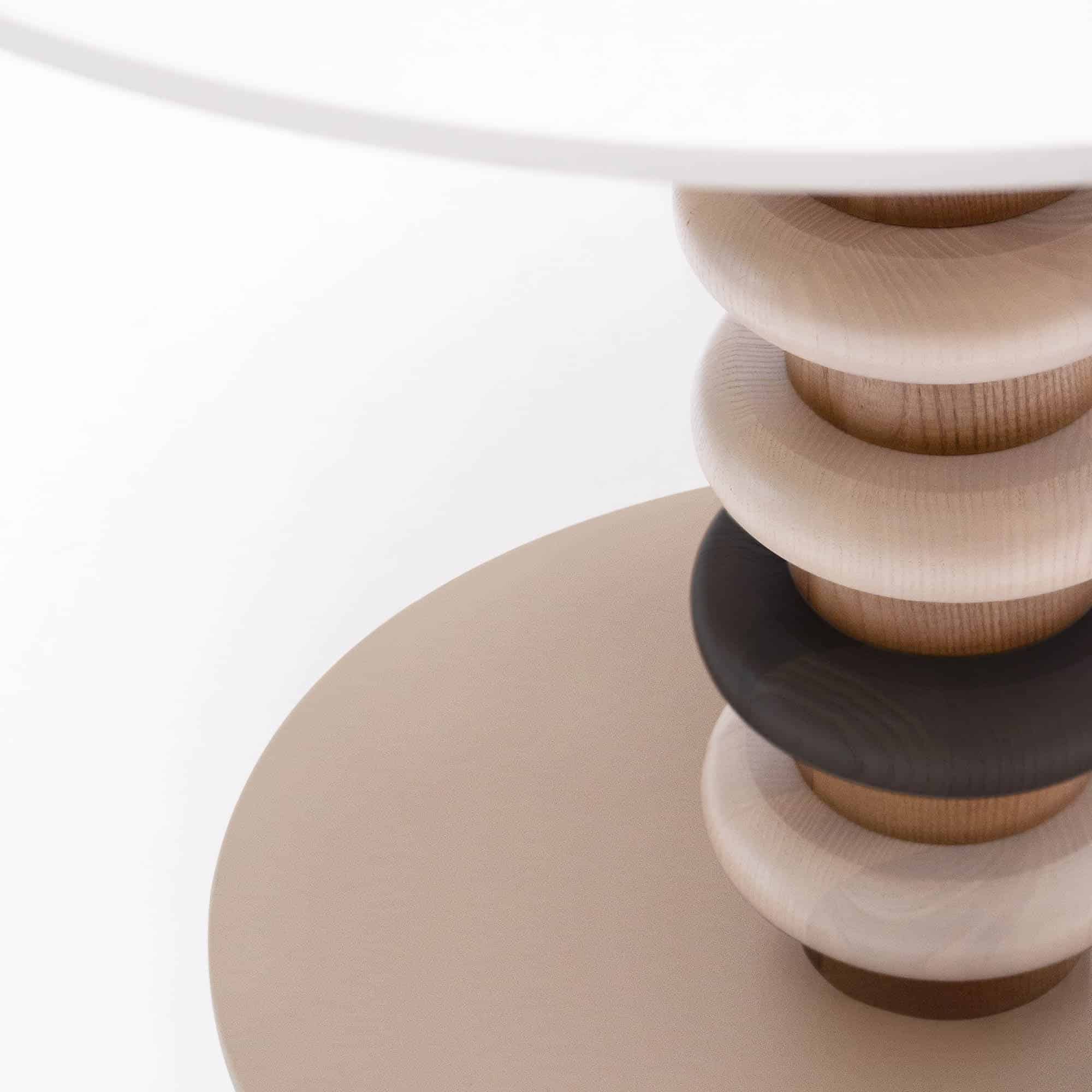 le design organique. Son piètement est orné d’anneaux en bois, symbolisant les cycles et la répétition., cette table apporte une touche originale et vivante à votre intérieur.