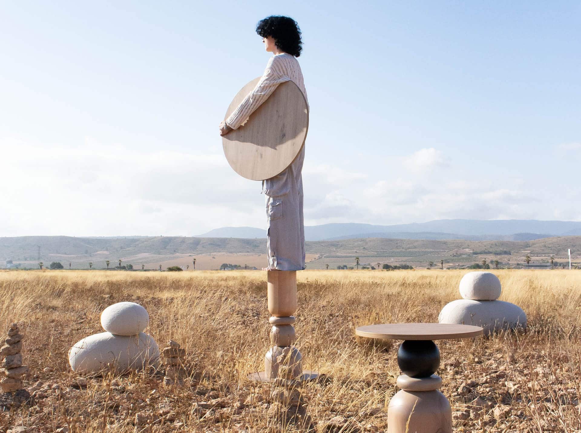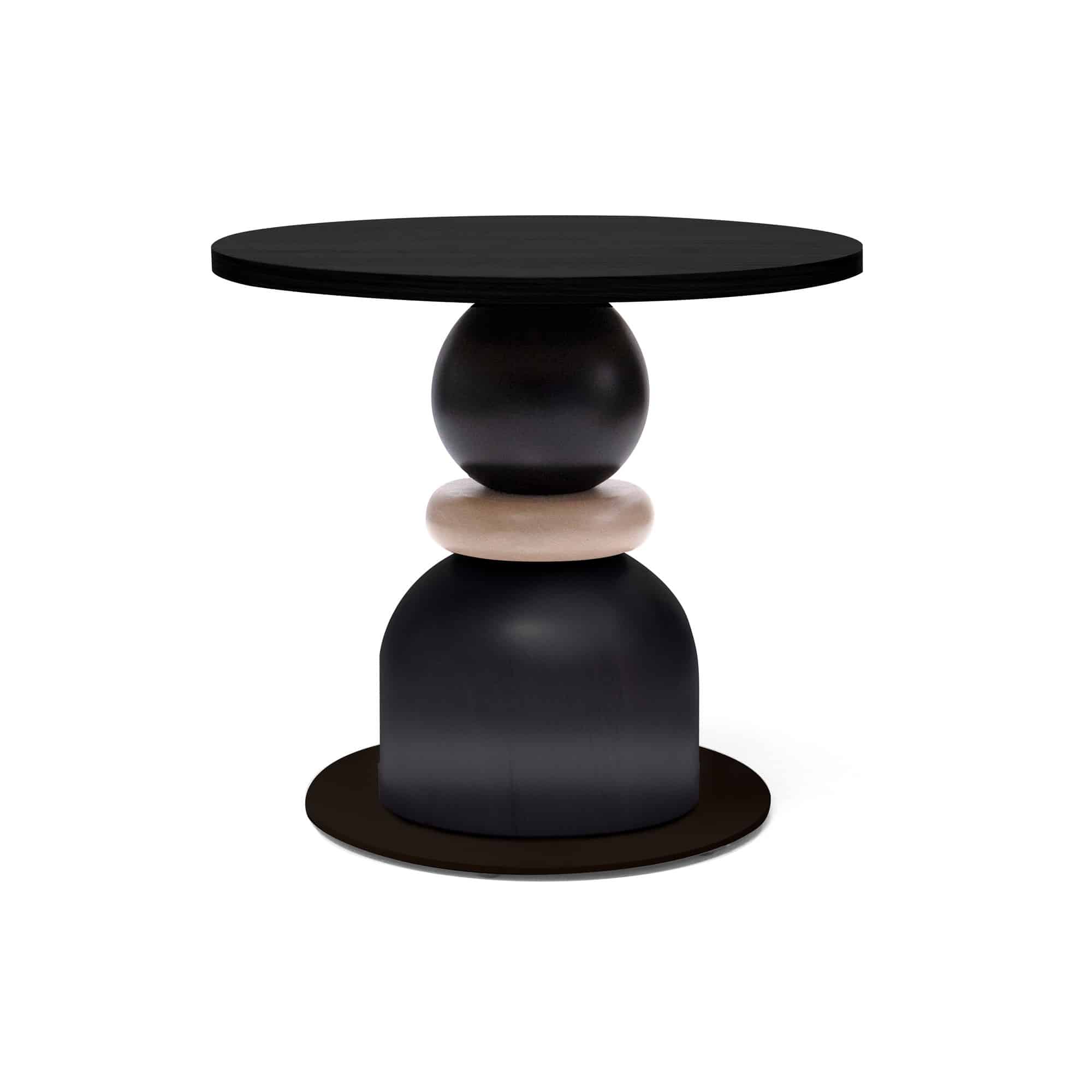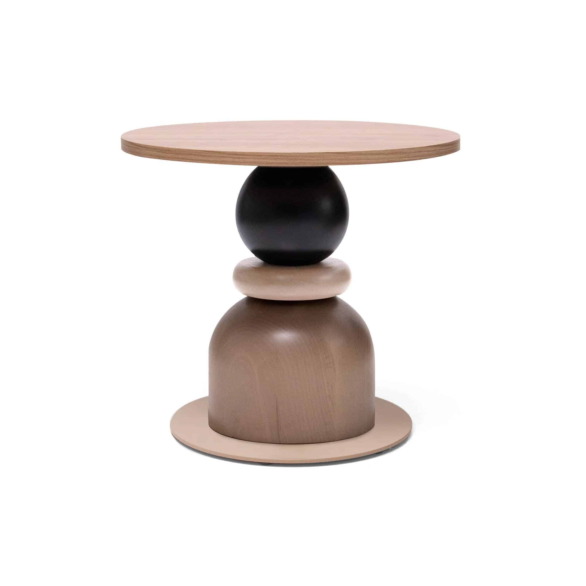 Cette table. Une combinaison de formes géométriques en bois parfaitement tournées. Design et harmonie dans votre décoration intérieure.Plateau en bois de hêtre/chêne massif, panneau de particules laminé, plaqué, teinté ou en grès cérame. Colonne en hêtre massif tourné. Finitions en teintures Base en métal noir laqué au four.HT 45 plateau diam 50