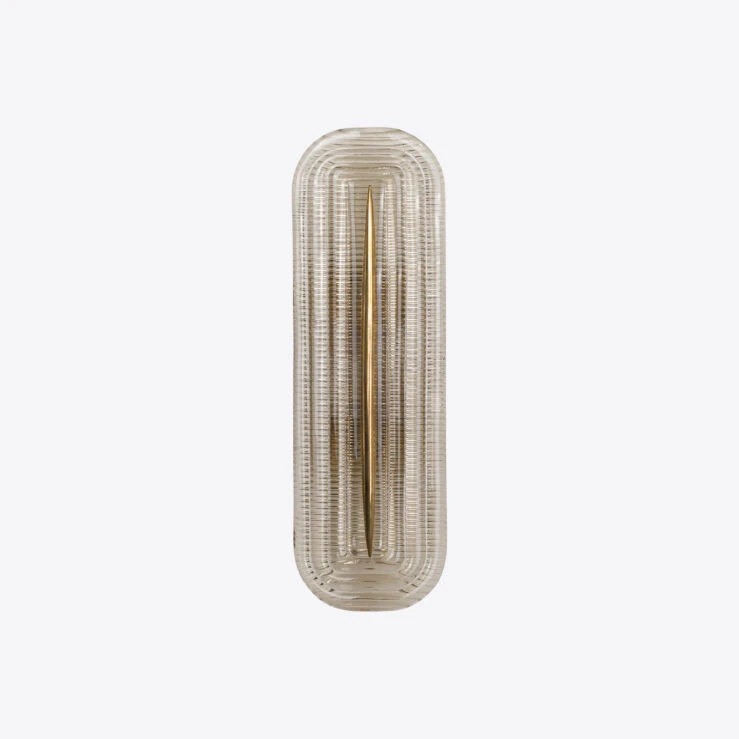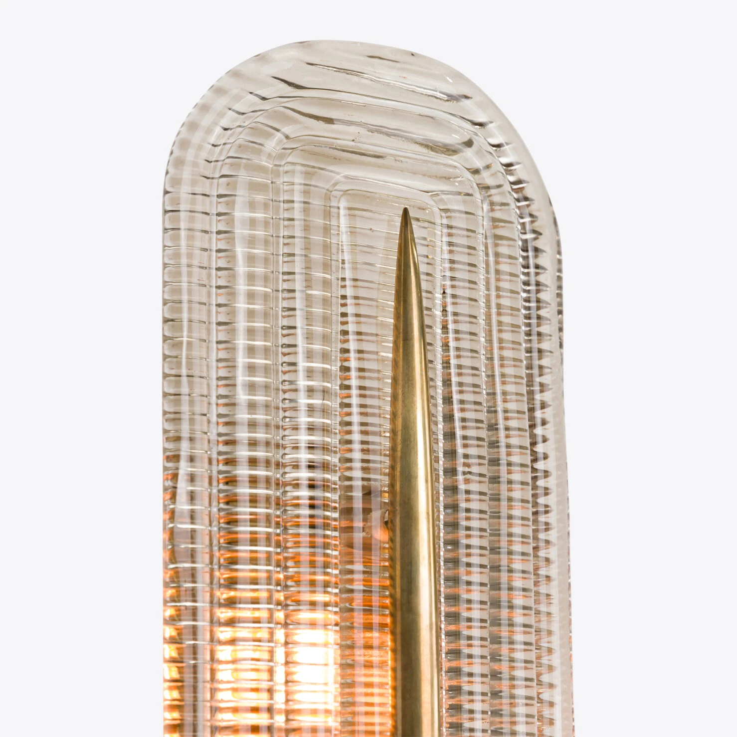 Sublimez votre intérieur avec cette superbe applique murale, alliant le design mid-century moderne à des influences brutalistes. Dotée d’un abat-jour en verre nervuré aux bords arrondis et d’une imposante pointe en laiton, cette lampe est conçue pour être légèrement décollée du mur grâce à deux fixations en laiton, créant un effet flottant qui apporte profondeur et dimension à votre espace.