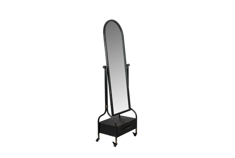 Miroir sur pied pivotant. métal fini avec une patine antique. 1 tiroir. Sur roulettes.