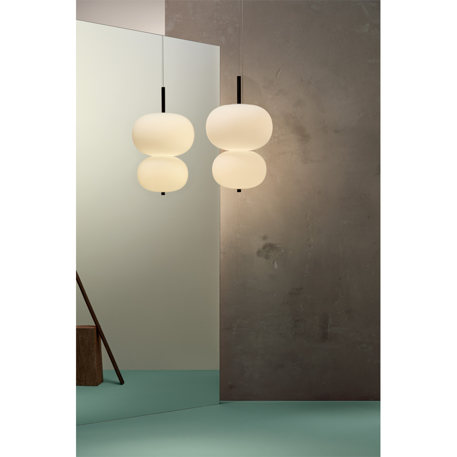 Suspension disponible en 2 tailles et 2 finition: bois naturel et noire . Verre soufflé.