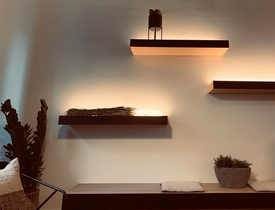 Dans chaque pièce ,il a crée des placards ainsi qu’un banc de décoration et des étagères illuminés de leds pour l’espace salon, amenant une ambiance feutrée.